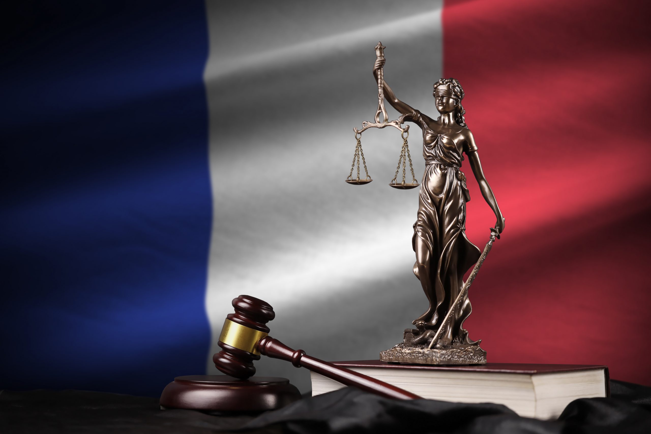 France flag with statue of lady justice, constitution and judge hammer on black drapery. Concept of judgement and guilt